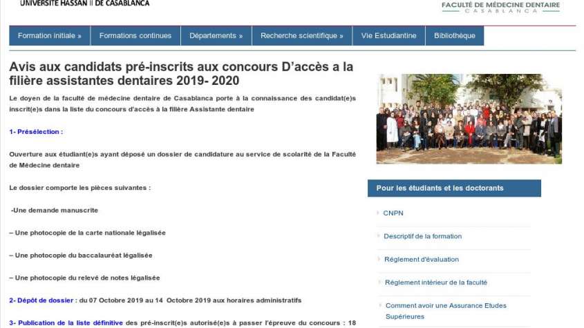 رابط الاعلان الأصلي (الفرنسية) : Avis aux candidats pré-inscrits aux concours D’accès a la filière assistantes dentaires 2019- 2020