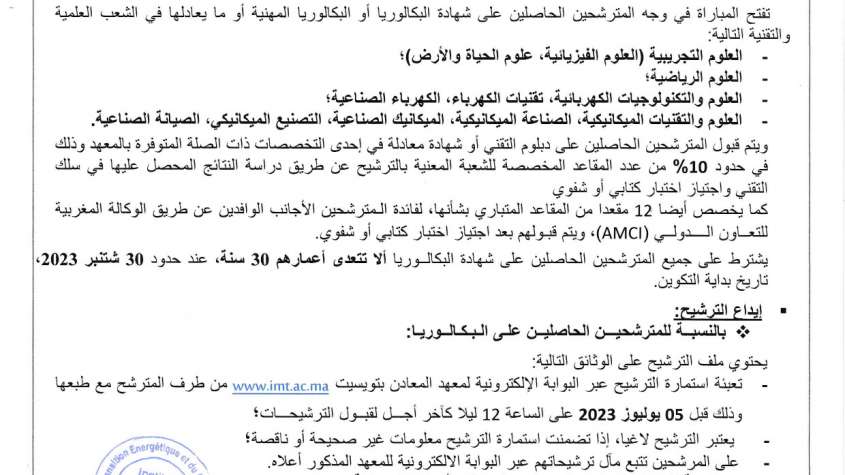 ينظم معهد المعادن بتويسيت، برسم السنة الدراسية 2023-2024، مباراة ولوج السنة الأولى عن طريق الانتقاء لتكوين تقنيين متخصصين في الشعبتين التاليتين: