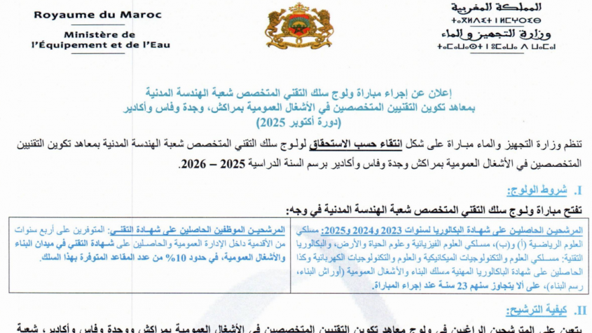 تنظم وزارة التجهيز والماء مباراة على شكل انتقاء حسب الاستحقاق لولوج سلك التقني المتخصص شعبة الهندسة المدنية بمعاهد تكوين التقنيين المتخصصين في الأشغال العمومية بمراكش وجدة وفاس وأكادير برسم السنة الدراسية 2015 – 2026.