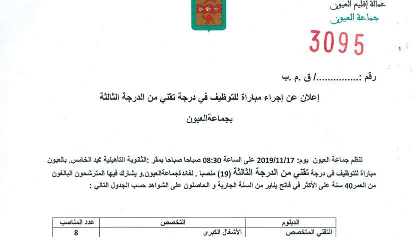 إعلان عن إجراء مباراة للتوظيف في درجة تقني من الدرجة الثالثة بجماعةالعيون