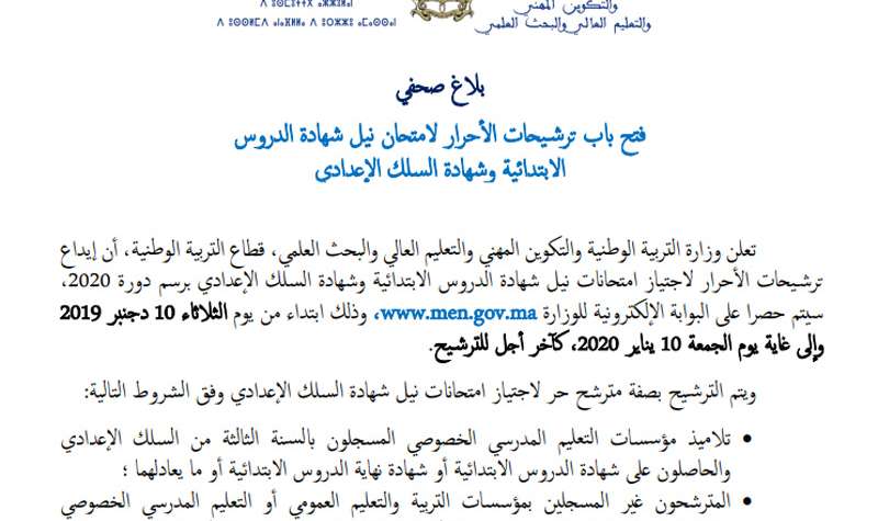 تعلن وزارة التربية الوطنية والتكوين المهني والتعليم العالي والبحث العلمي، قطاع التربية الوطنية، أن إيداع ترشيحات الأحرار لاجتياز امتحانات نيل شهادة الدروس الابتدائية وشهادة السلك الإعدادي برسم دورة 2020، سيتم حصرا على بوابة ترشيح الأحرار لاجتياز الامتحانات الإشهادية ، وذلك ابتداء من يوم الثلاثاء 10 دجنبر 2019 وإلى غاية يوم الجمعة 10 يناير 2020، كآخر أجل للترشيح.