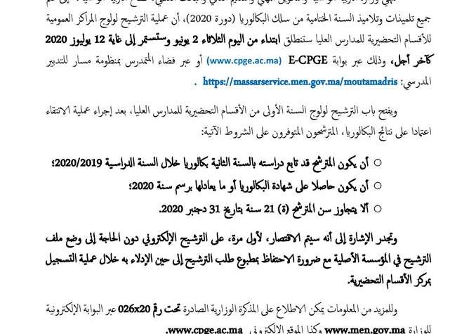 عملية الترشيح لولوج المراكز العمومية للأقسام التحضيرية للمدارس العليا ستنطلق إبتداءً من اليوم الثلاثاء و ستستمر إلى غاية 12 يوليوز 2020 كآخر أجل، وذلك عبر بوابة E-CPGE أو عبر فضاء المتمدرس بمنظومة مسار للتدبير المدرسي