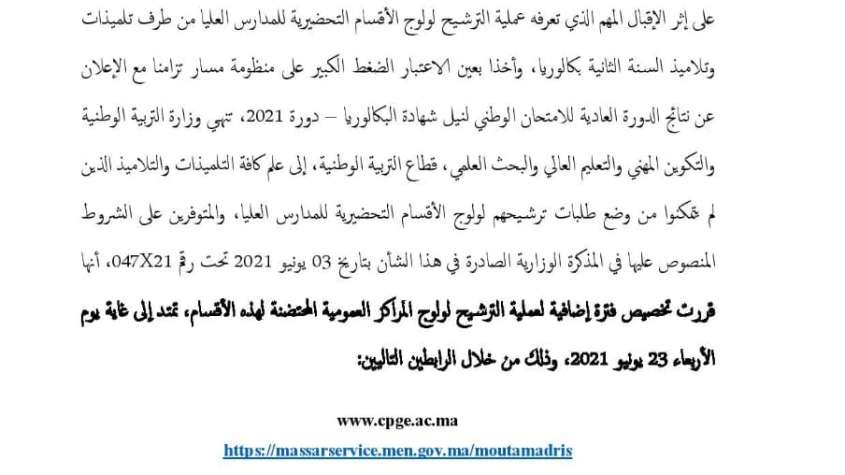 عل إثر الإقبال المهم الذي تعرفه عملية الترشيح لولوج الأقسام التحضيرية للمدارس العليا من طرف تلميذات وتلاميذ السنة الثانية بكالوريا، وأخذا بعين الاعتبار للضغط الكير عل منظومة مسار تزامنا مع الإعلان عن نتائج الدورة العادية للامتحان الوطي لنيل شهادة البكالوريا دورة 2021، تنهي وزارة التربية الوطنية و التكوين المهني والتعليم العالي والبحث العلمي، قطاع التربة الوطنية، إلى علم كافة التلميذات والتلاميذ اللذين لم يتمكنو من وضع طلب الترشيح لولوج الأقسام التحضيرية للمدارس العليا، والمتوفرون عل الشروط المنصوص عنها في المذكرة الوزارية الصادرة في هذا الشأن بتاريخ 3 يونيو 2021,
