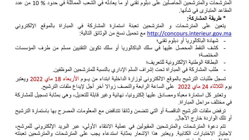 تتظم وزارة الداخلية يوم الأحد 03 يوليوز 2022 بمعاهد التكوين التقني التابعة للوزارة، وفي مراكز أخرى عند الاقتضاء، مباراة ولوج سلك تكوين التقيين المتخصصين في شعبة الهندسة المدنية تخصص أشغال الجماعات الترابية.