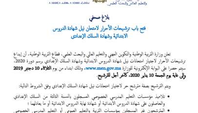 فتح باب ترشيحات الأحرار لامتحان نيل شهادة الدروس الابتدائية وشهادة السلك الإعدادي 2020