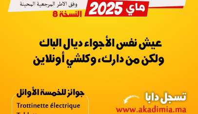 - انطلاق التسجيل في البكالوريا التجريبية عبر الأنترنت 2025- انطلاق التسجيل في البكالوريا التجريبية عبر الأنترنت 2025 مع احترام تام للأطر المرجعية المحينة رابط التسجيل: www.akadimia.ma الخمسة الأوائل في هذا الامتحان سيحصلون على جوائز قيّمة : Trottinette électrique Tablette Smartphone Ordinateur portable Séjour à Marrakech وصاحب المرتبة الأولى له أولوية اختيار الجائزة التي يرغب بها، ثم الثاني يختار من… أكمل القراءة »