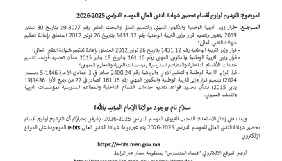 - الترشيح لولوج أقسام تحضير شهادة التقني العالي للموسم الدراسي 2026-2025.- ابتداء من 20 يونيو إلى غاية 15 يوليوز 2025 الترشيح يتم عبر أحد الروابط التالية: https://e-bts.men.gov.ma https://massarservice.men.gov.ma/moutamadris المذكرة الوزارية BTS هام جدا: بالنسبة للمترشحين الذين تخول لهم شهادة البكالوريا المحصل عليها أكثر من ستة (6) اختيارات، يجب عليهم اختيار ستة (6) تخصصات فقط، وتمنح لهم المنظومة تلقائيًا ثلاثة (3) اختيارات… أكمل القراءة »