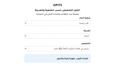 - أداة تفاعلية لاختيار التخصص المناسب في مباراة ISPITS- اختر التخصص حسب الشعبة والمدينة نقدم لكم أداة تفاعلية تسهّل على المترشحين لمباراة ولوج المعاهد العليا للمهن التمريضية وتقنيات الصحة (ISPITS) معرفة التخصصات المتاحة حسب: ✅ شعبة الباكالوريا✅ المدينة التي يرغبون في اجتياز المباراة بها بمجرد اختيار الشعبة والمدينة، سيظهر لك: 📌 عدد المقاعد المتوفرة حسب التخصص📌 المادة الأولى في… أكمل القراءة »