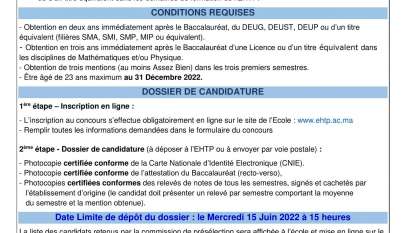 مباراة الولوج إلى السنة الأولى بالمدرسة الحسنية للأشغال العمومية EHTP آخر أجل للترشيح هو 15 يونيو 2022 الاعلان عن تنائج الانتقاء الأولي: 01 يوليوز 2022. تاريخ اجراء الاختبار الكتابي: الأربعاء…